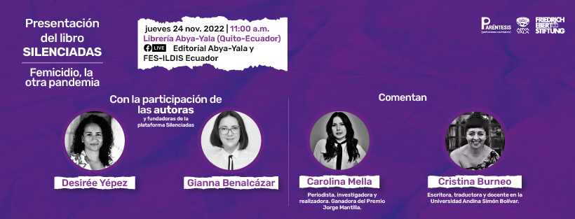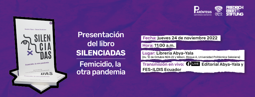 FES-ILDIS Ecuador y Editorial Abya-Yala invitan a la presentación del libro Silenciadas. Feminicidio, la otra pandemia de Desirée Yépez y Gianna Benalcázar. Se trata de una investigación profunda y sensible -y es la primera- del especial de periodismo investigativo Paréntesis.