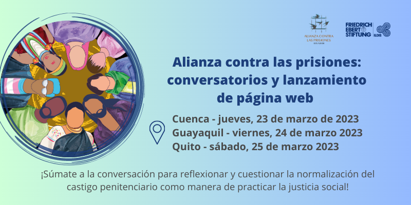 FES-ILDIS Ecuador yLa Alianza Contra las Prisiones invitan a participar de una serie de conversatorios para reflexionar y cuestionar la normalización del castigo penitenciario como manera de practicar la justicia social, que se llevarán a cabo los días 23, 24 y 25 de marzo, en Cuenca, Guayaquil y Quito, respectivamente. Además, en este marco, se realizará el lanzamiento de la página web: https://contraprisiones.org/