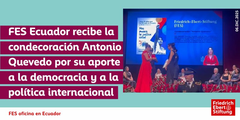 El 6 de diciembre, la Friedrich-Ebert-Stiftung (FES) en Ecuador fue distinguida con la condecoración Antonio Quevedo, otorgada por el Concejo Metropolitano de Quito en el marco de los 491 años de fundación de la ciudad. Este reconocimiento destaca nuestro trabajo  para el dialogo político internacional y nuestra contribución sostenida al fortalecimiento democrático del país.