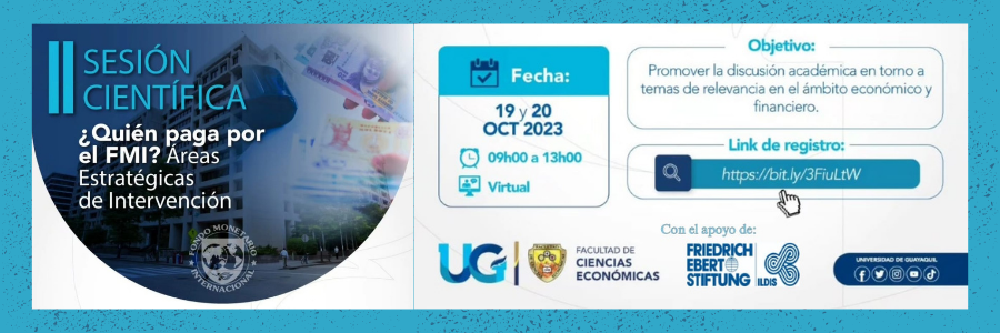 La Facultad de Ciencias Económicas de la Universidad de Guayaquil y Fes Ildis Ecuador invitan a participar de la sesión científica ¿Quién paga el FMI? Áreas de Inversión Estratégicas, donde se discutirá sobre el impacto de las políticas del FMI en la economía ecuatoriana.